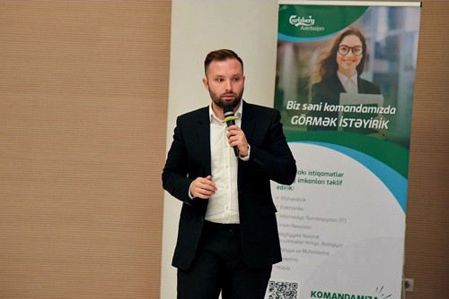 Carlsberg Azerbaijan-ın Marketinq direktoru Anton Panasenko və İnsanlar və Mədəniyyət departamentinin İşə Qəbul və Onboarding üzrə mütəxəssisi Təranə Hüseynbəyova təqdimat zamanı Carlsberg Group-un 175 ildən çox pivəbişirmə irsi, marketinq strateqiyaları, şirkət dəyərləri və karyera inkişafı imkanları haqqında məlumat verdilər.